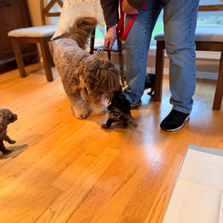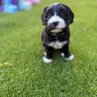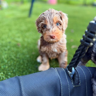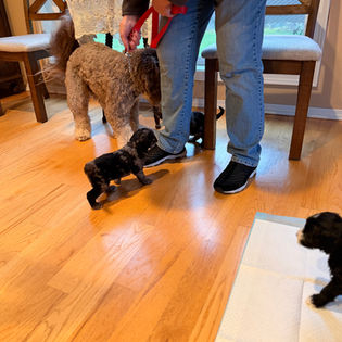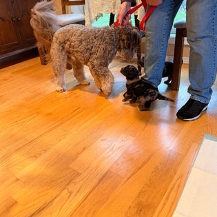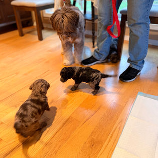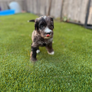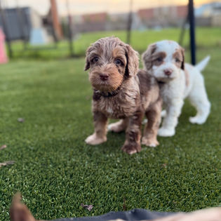 Labradoodles of Montana Breakfast at Tiffany's and Moonlit Acres Mr. Bo Jangles had a fantastic May 2023 litter and May 2025 litter. We had amazing temperament in these past litters producing multiple service and therapy dog for special needs children classes, PTSD veterans dogs for NW Battle Buddies and on an Alaskan military base. We definitely want to repeat that combo! We finally got a chocolate female merle from this litter!!! Been hoping and praying for one from Tiffany for four years! She was very generous to share more merle pattern with us than she has in her previous 3 litters combined! She gave us 6 beautiful merles, one of which is a parti, 1 black tuxedo with four white paws, and a chocolate tuxedo with white toes! At this time this litter is fully reserved except for a possible guardian for our keeper girl.
